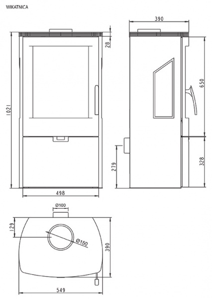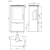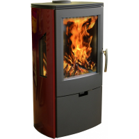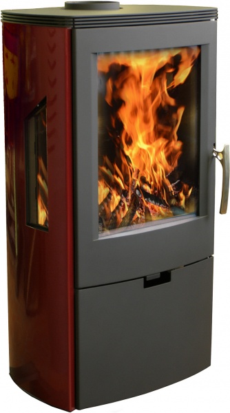 Třístranná krbová kamna WIKANTICA černá/vínovočervená, výkon 8 kW (4 až 12kW), účinnost 82% průměr kouřovodu 150 mm - horní, externí přívod vzduchu pro spalování