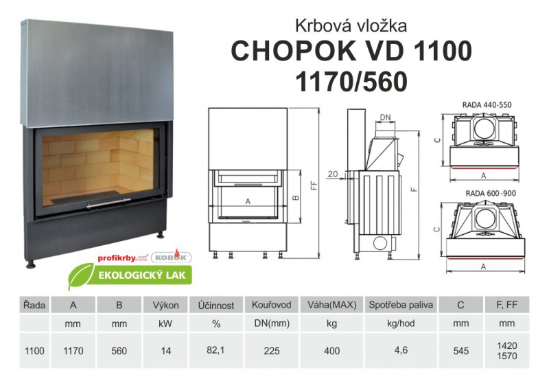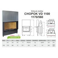 Krbová vložka KOBOK CHOPOK 1100 (1170) 560 VD s výsuvem, portál 1170x560 mm, průměrný výkon 14kW, účinnost 82%, použití pro sálavé, akumulační a teplovzdušné stavby