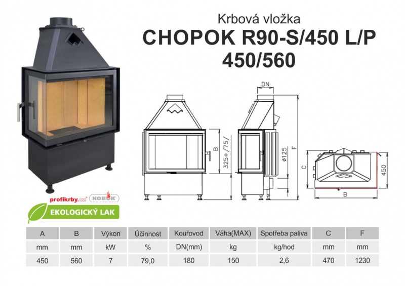 Krbová vložka KOBOK CHOPOK R90Sx450 450 560 - Rohová - Pravá, průměrný výkon 7kW, účinnost 79%, kouřovod 160mm, použití pro sálavé, akumulační a teplovzdušné stavby, výroba:Kobok. servis:Profikrby